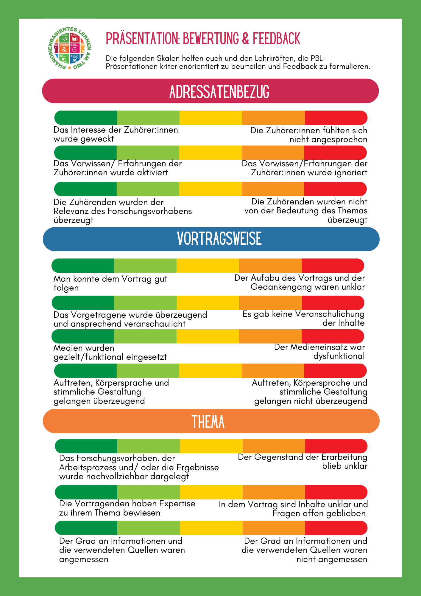Die farblich gestalteten Skalen erleichtern ein schnelles, differenziertes Urteil und bilden eine strukturierte Grundlage für mündliches oder schriftliches Feedback. Wichtig: Stütze deine Einschätzung bei der Rückmeldung auf konkrete Beobachtungen. Mache z.B. deutlich, wie es den Vortragenden gelungen ist, das Interesse der Zuhörenden zu wecken oder inwiefern auch körpersprachlich Souveränität ausgestrahlt worden ist.
