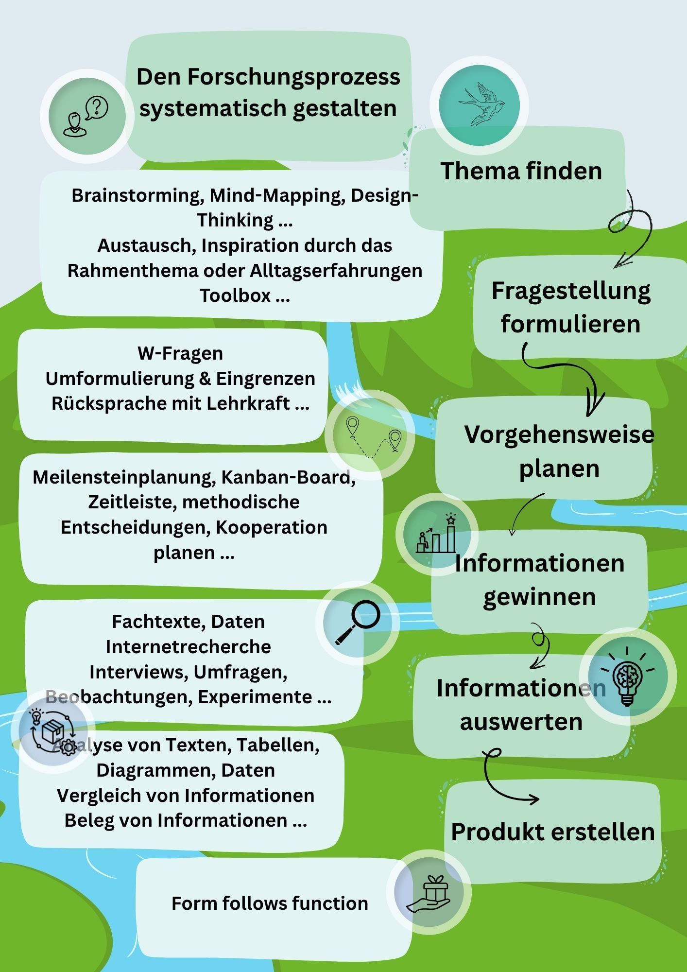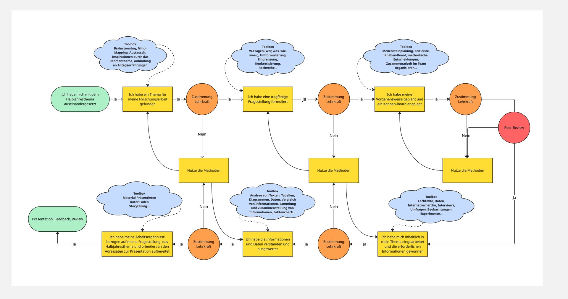 Die PBL-Roadmap oder die PBL-Landscape hilft euch als Gruppe die aktuelle Phase eurer Projektarbeit zu visualisieren und euch gleichzeitig Klarheit darüber zu verschaffen, mit welcher Zielsetzung ihr aktuelle an eurem Forschungsvorhaben arbeitet. Innerhalb der Lerngruppe könnt ihr und auch die begleitende Lehrkraft sehen, woran andere Gruppen aktuell arbeiten, und könnt euch ggf. untereinander austauschen.